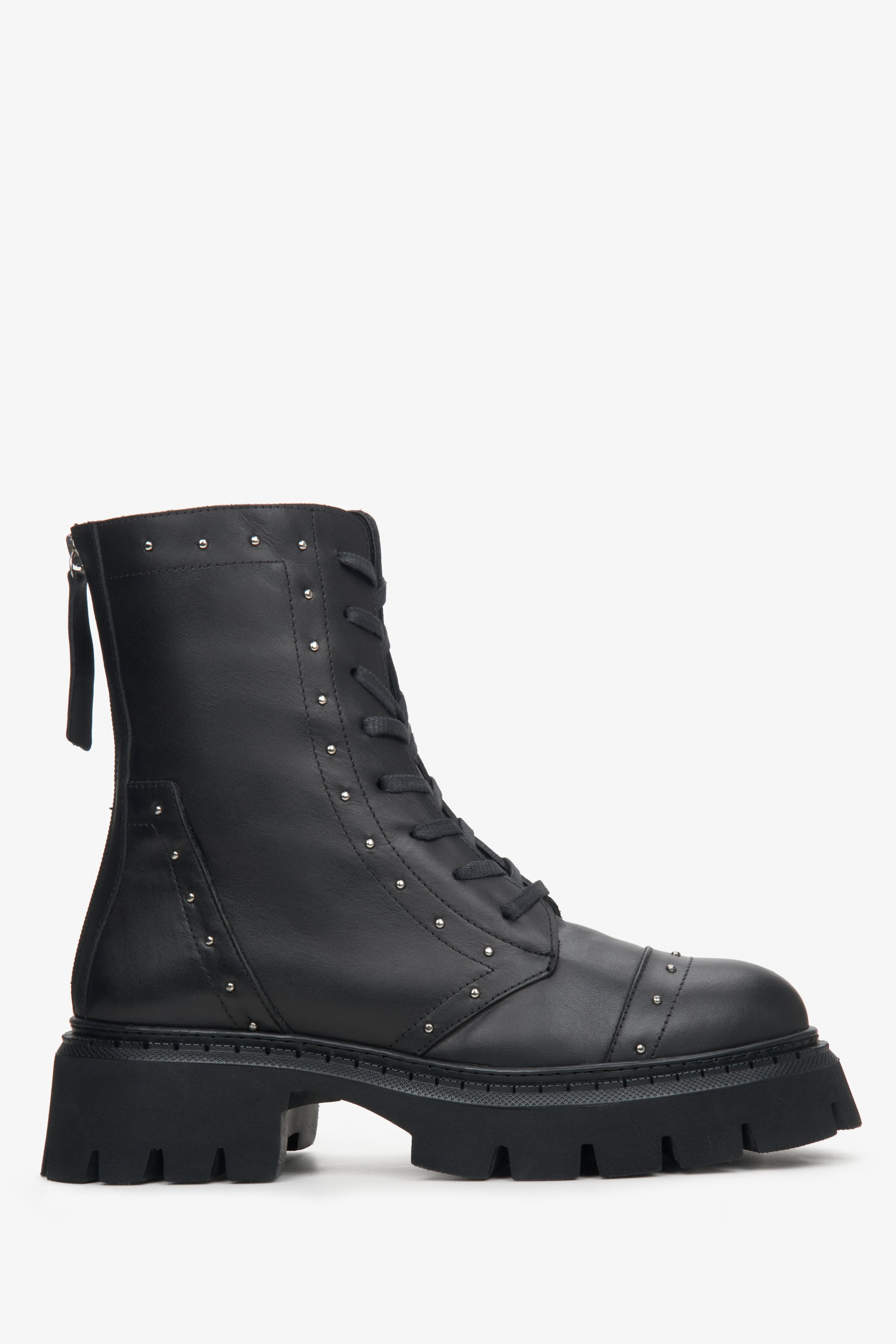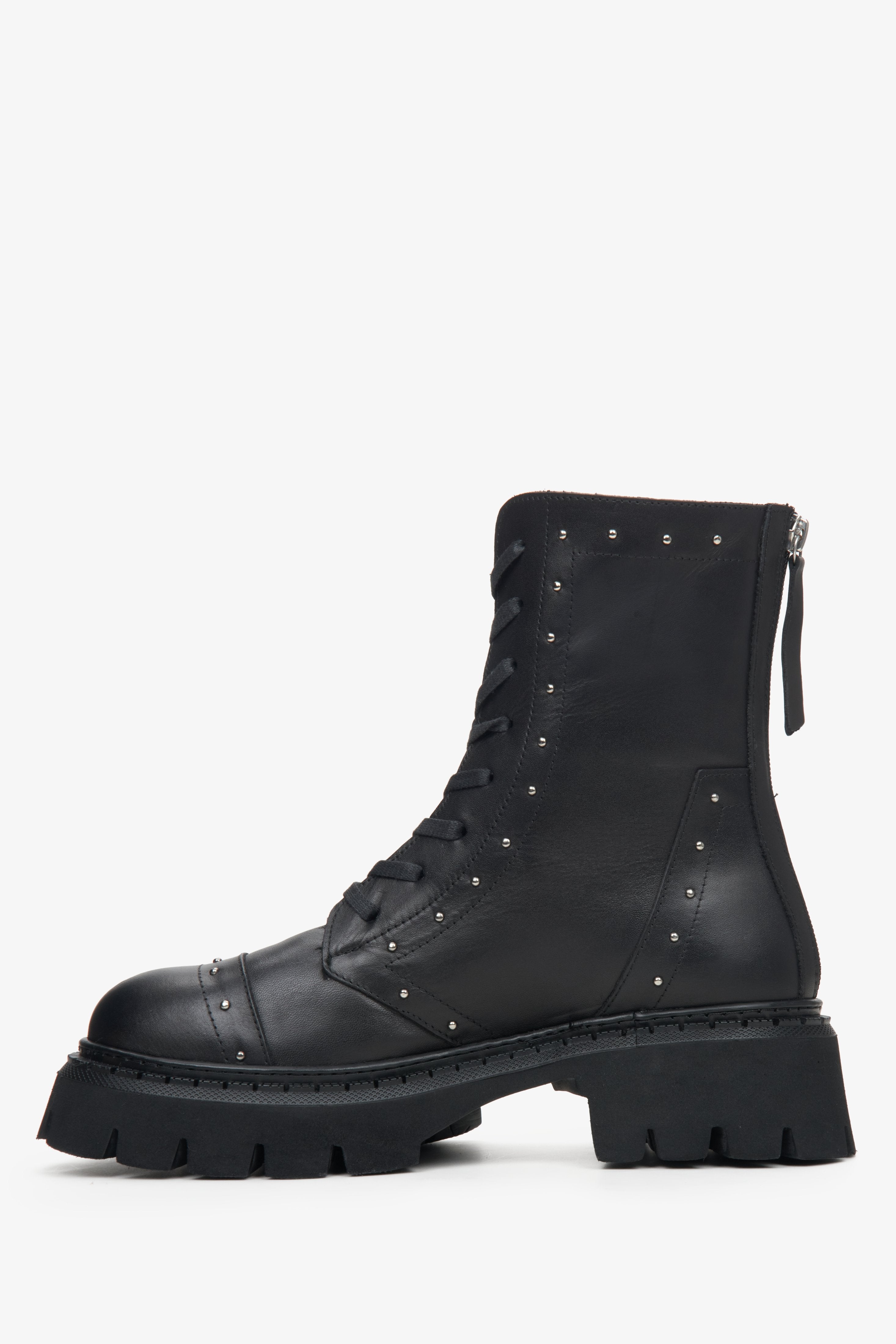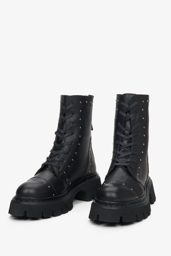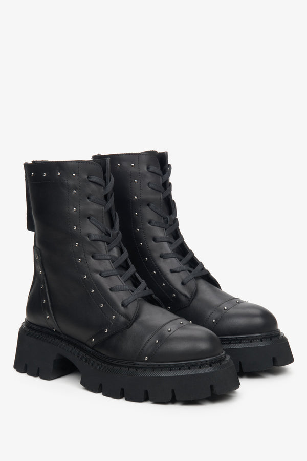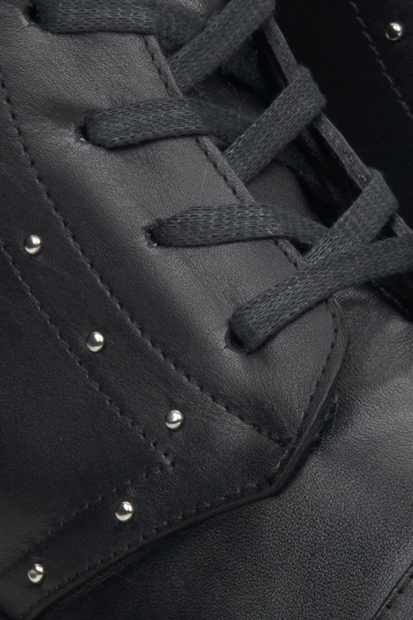 Black leather ankle boots Estro - a close-up on decorative lacing and silver studs.