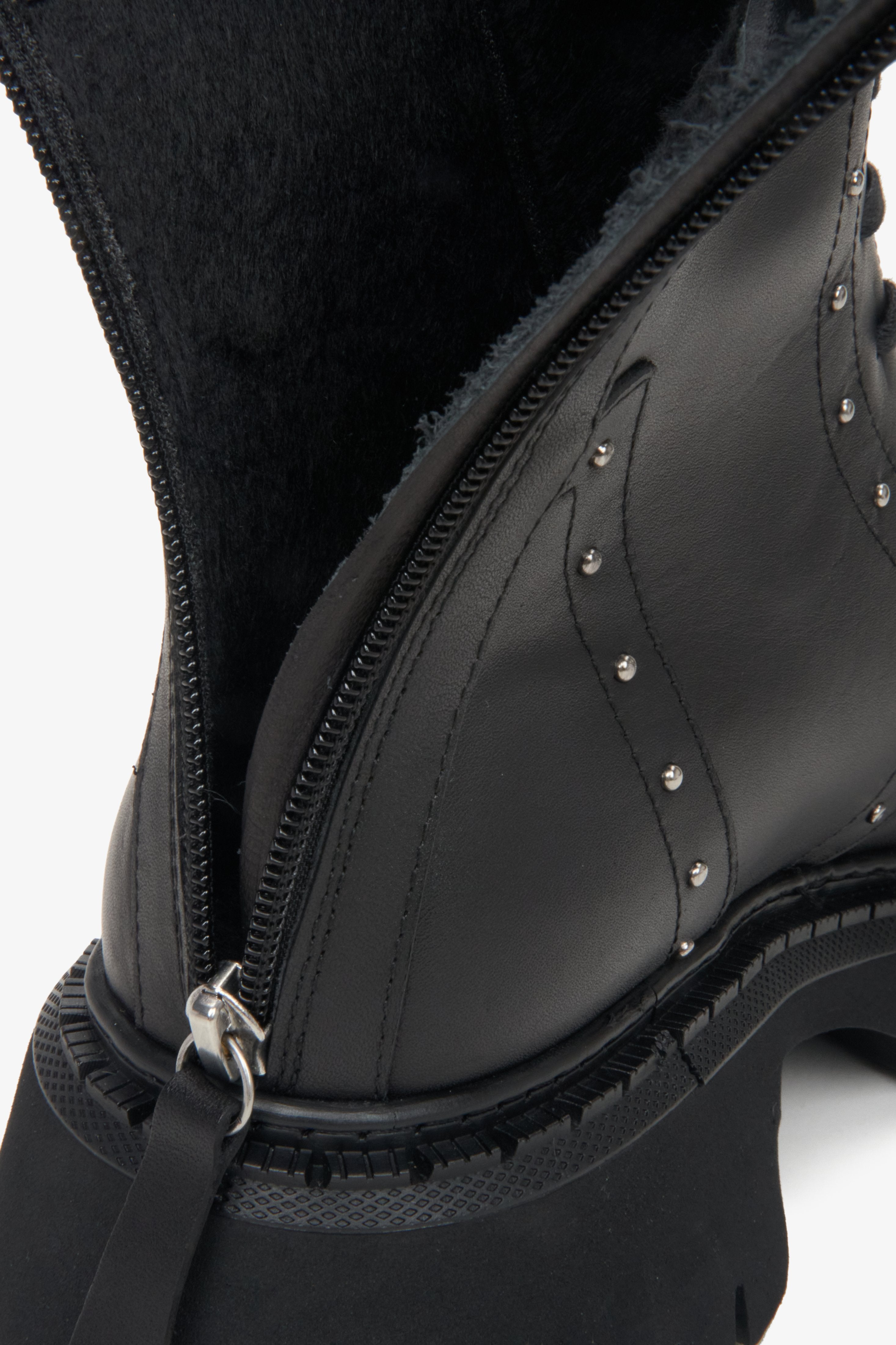 Black leather insulated ankle boots Estro - a close-up on a shoeline.