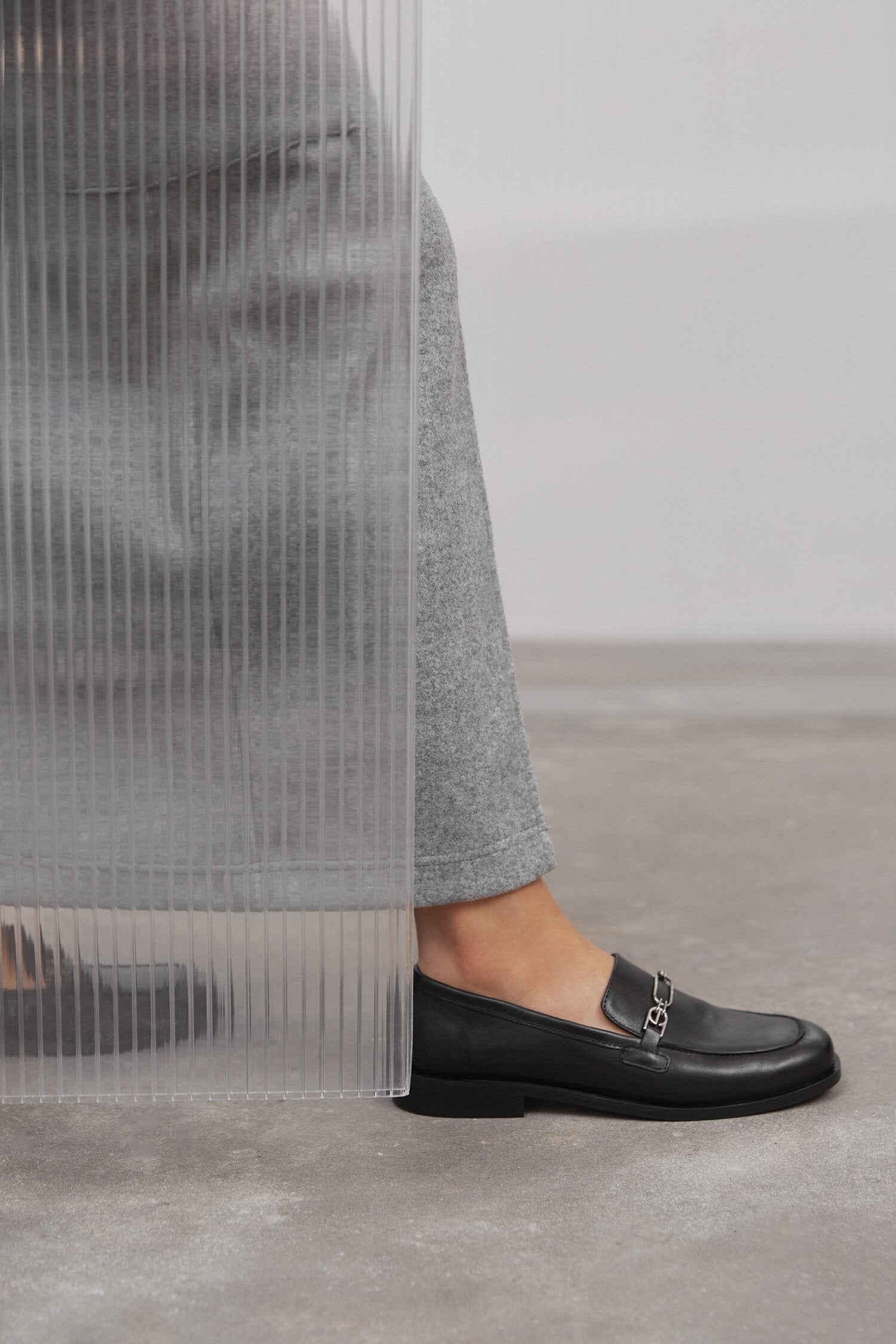 Elevate your style with women's penny loafers. Crafted from genuine charcoal black leather, these slip-on shoes feature a delicate silver chain for a touch of luxury. Perfect for spring, pair with pants or a dress for a sophisticated look. Add a touch of class to any outfit.