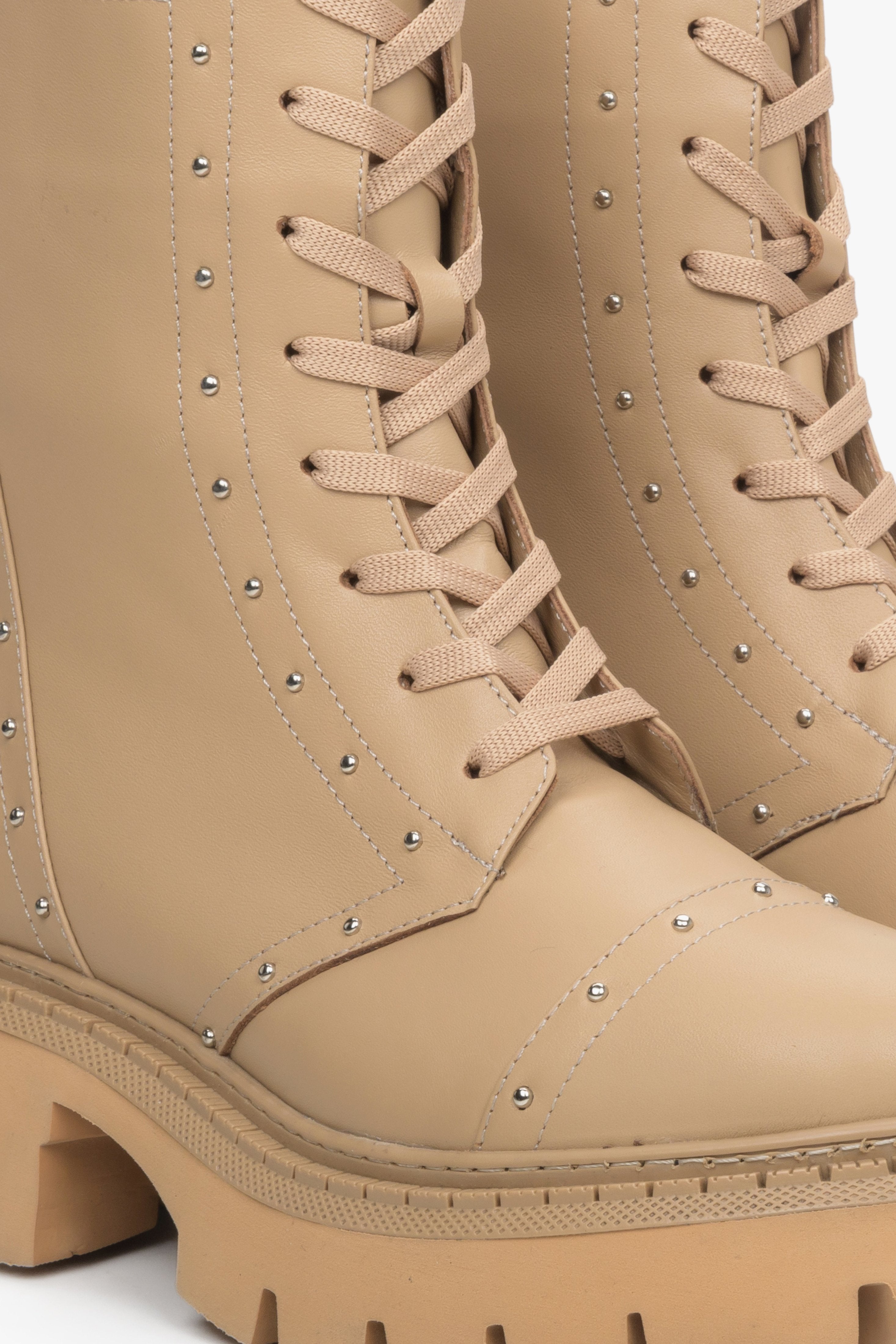 Take on the elements with these daring women's beige leather ankle boots! Made of genuine leather and softly insulated, these boots will keep you warm while also adding a bold statement to your outfit with their decorative silver studs. The zip and lacing add an edgy touch, while the elastic, chunky platform provides comfort and stability. Perfect for the European winter and cold fall, pair these boots with jeans and a warm jacket for the ultimate risk-taker look!