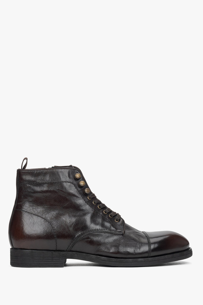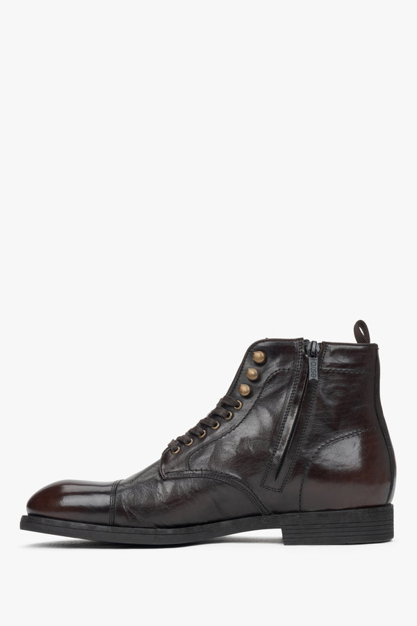 Discover the perfect combination of style and comfort with these men’s ankle boots from Estro's collection. Designed for autumn and spring, these dark brown boots are crafted from premium natural leather with a gently crinkled texture that adds a unique touch. The natural leather lining ensures breathability and comfort throughout the day, while the flat heel, under 5 cm, offers practicality without compromising on style. The zipper fastening allows for easy wear, making these boots an essential addition to your wardrobe.
