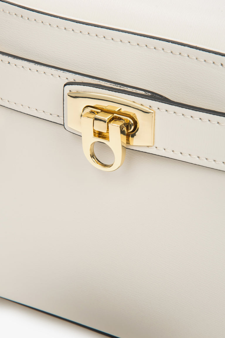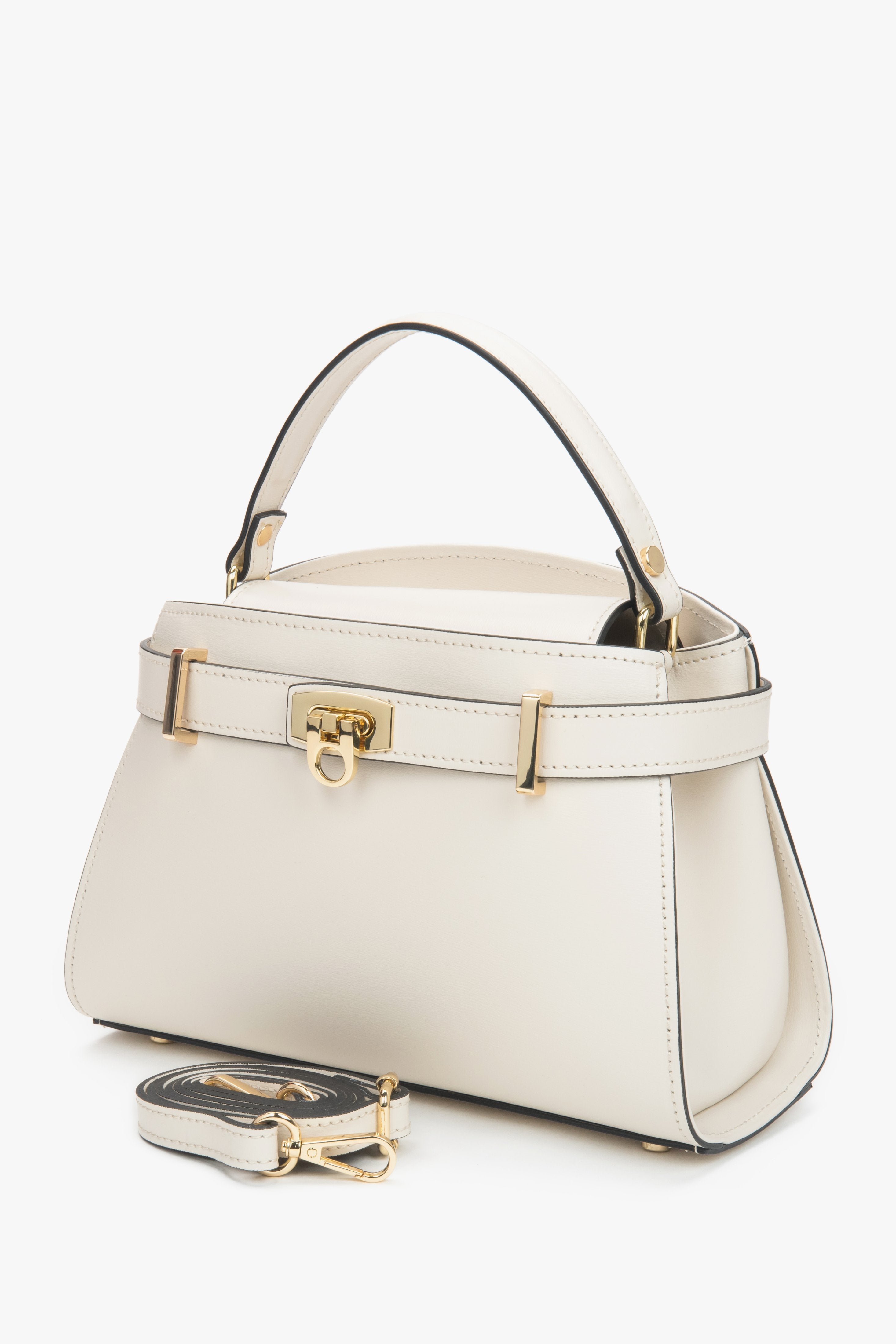 Elevate your everyday style with this elegant light beige top-handle bag, expertly crafted from 100% premium Italian genuine leather. Featuring a structured silhouette accented with gold-tone hardware, it offers a polished, timeless appeal. The spacious interior includes one main compartment and two pockets for organized storage, all secured with a refined buckle closure. Measuring 26 cm x 19 cm x 8 cm, it comes with a short 28 cm handle and a detachable, adjustable 97 cm strap, allowing for versatile hand or shoulder carry. Perfect for day-to-evening transitions.