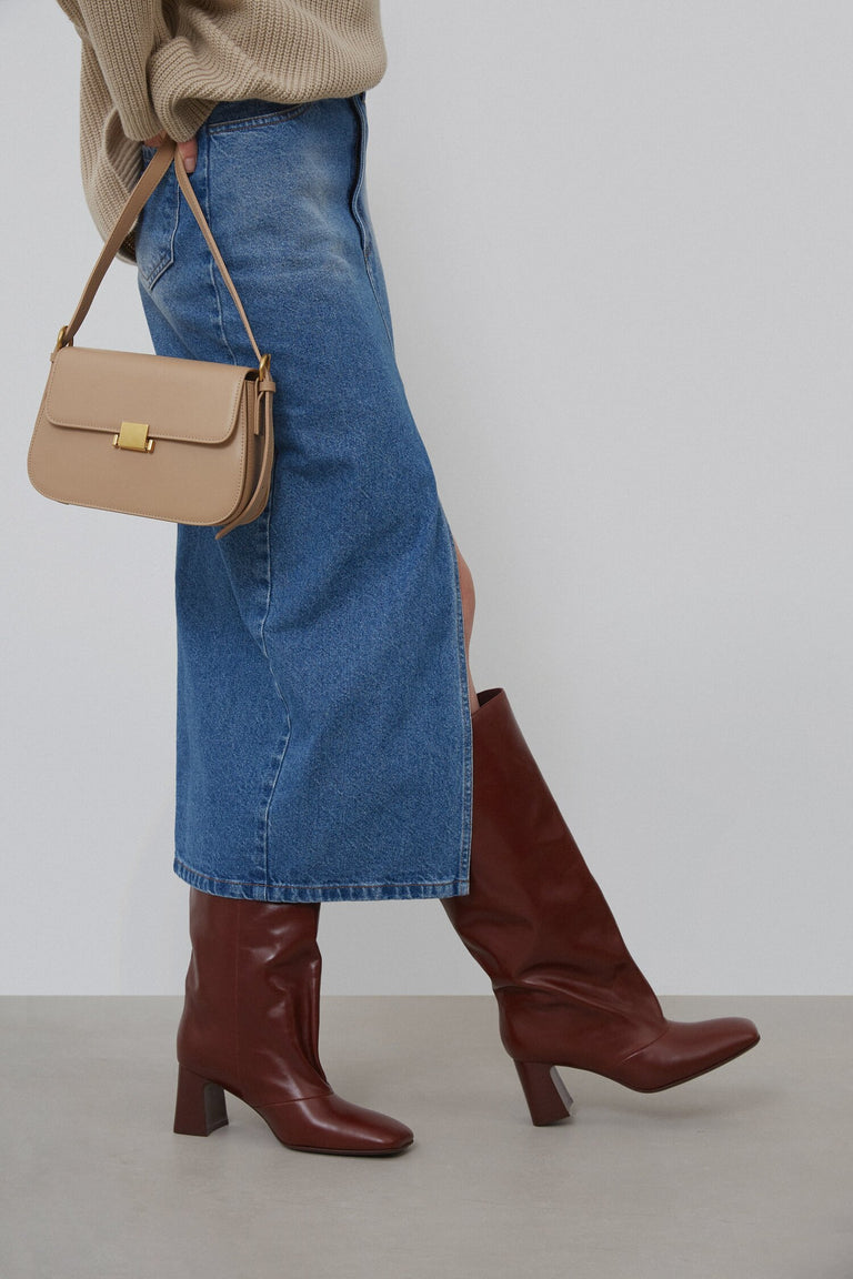 Indulge in luxury with our oversized boots, crafted from exquisite burgundy genuine leather. The oversized shaft and block heel create a sophisticated silhouette, while the soft shaft and square toe provide ultimate comfort. A versatile and elegant addition to any wardrobe, pair with a dress or mid-size skirt for a chic look.