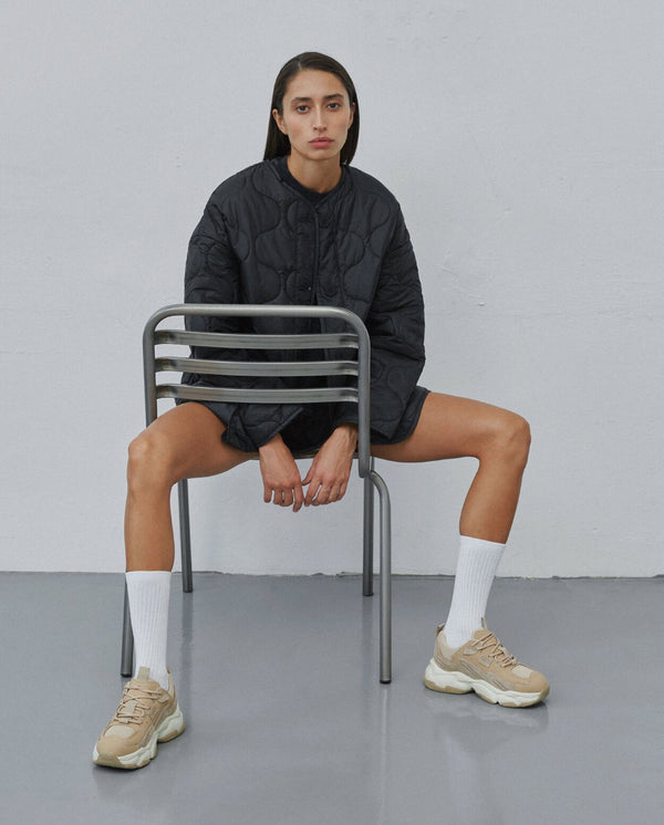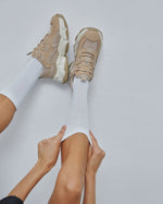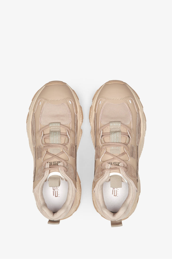 Introducing the women's sneakers — designed to be an effortless fusion of style and highest comfort. These light brown, fashionably chunky platform sneakers feature a classic laced up design crafted with natural leather, suede, and textile, making them an ideal choice for stylishly comfortable everyday wear. Perfect for both the fall and spring, these sneakers are sure to take any look from plain to polished.