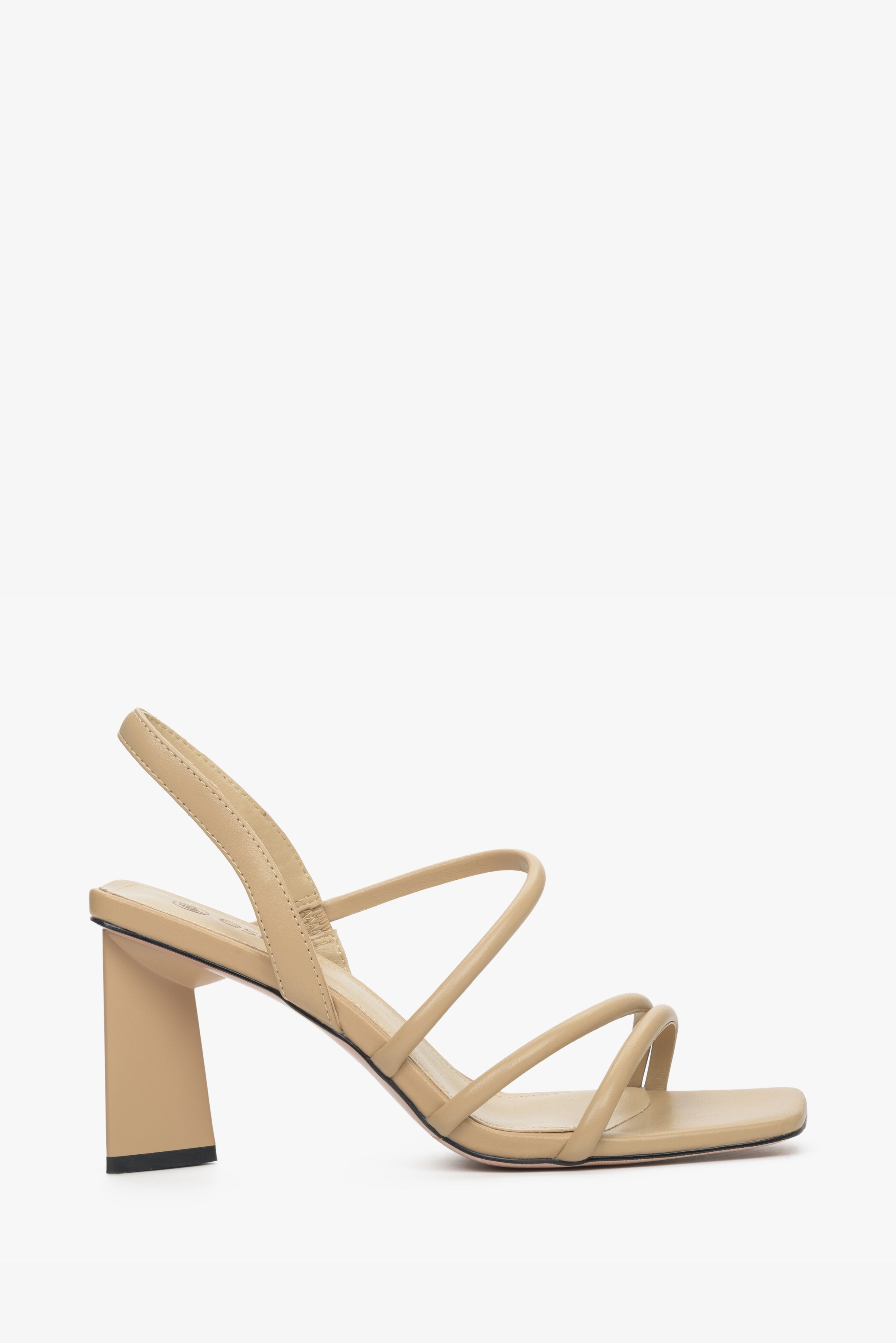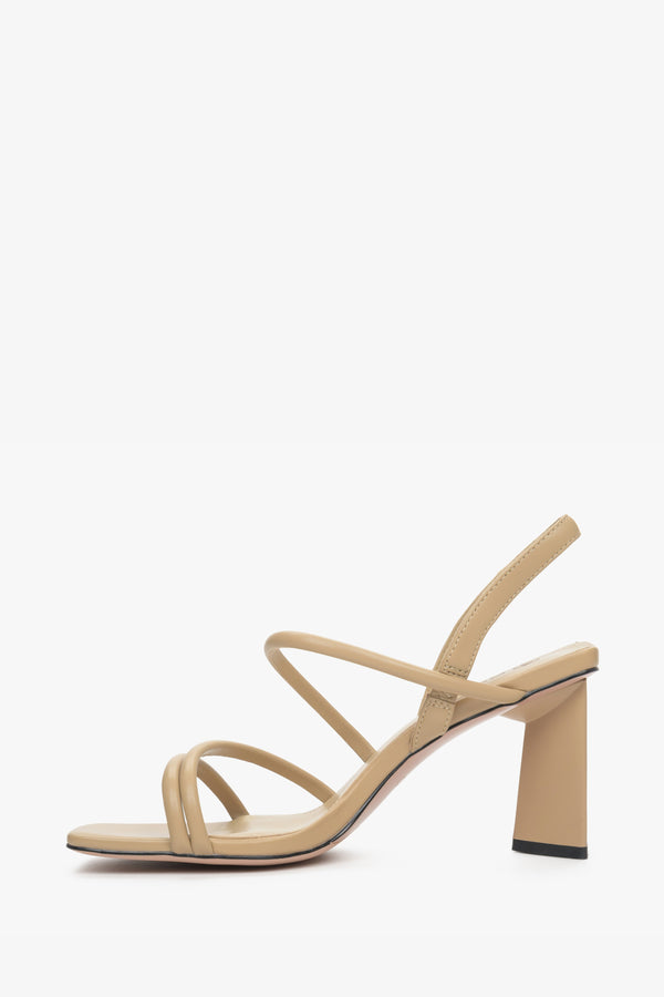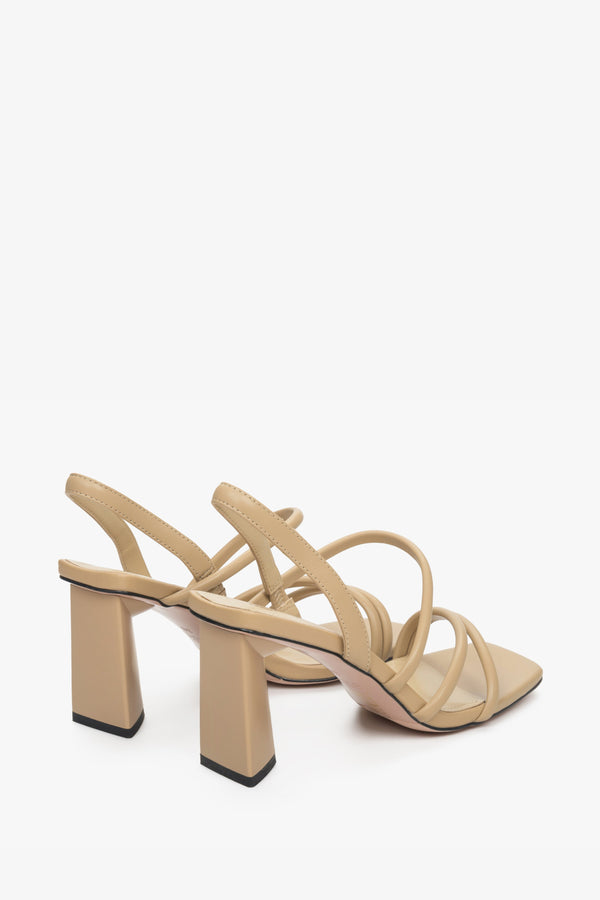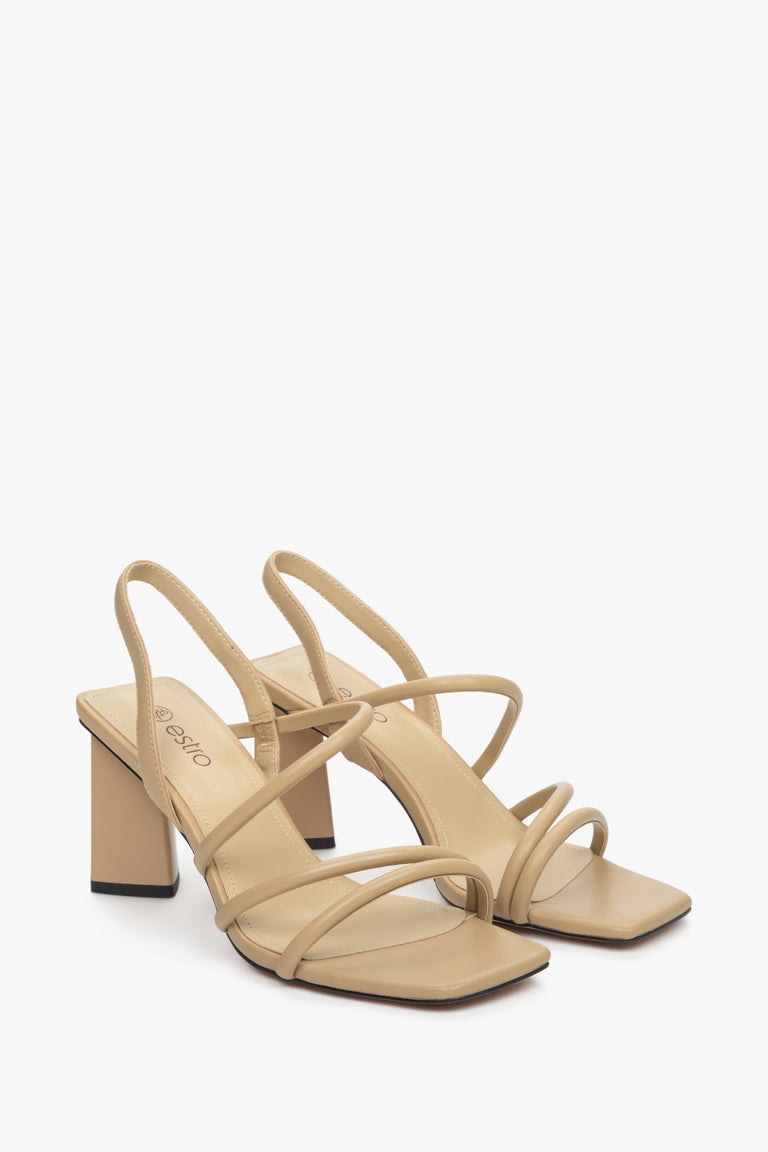 Sand beige women's strappy sandals on a block heel of Estro brand - presentation on a model.